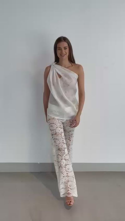 Featuring top is made from a lightweight, semi-sheer fabric with a subtle butterfly print, adding a soft and feminine touch. It features a draped, asymmetrical neckline with gentle folds that create a graceful and flowy silhouette. The single-shoulder design gives it a chic and modern look, perfect for dressy casual or evening occasions.