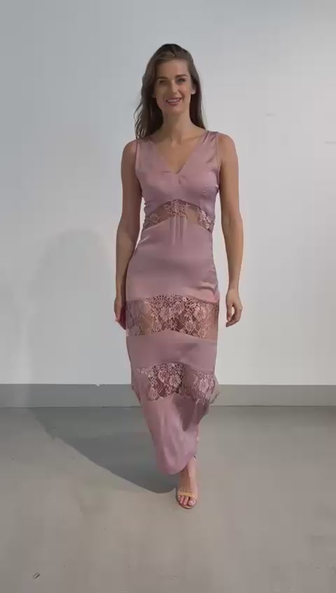 Featuring dress a V-neckline and a fitted silhouette that flows into a long, floor-length skirt. It has delicate sheer lace panels at the waist and along the skirt, creating horizontal sections that alternate between satin and floral lace, adding a romantic and feminine touch. The dress also includes a small slit at the hem for ease of movement.