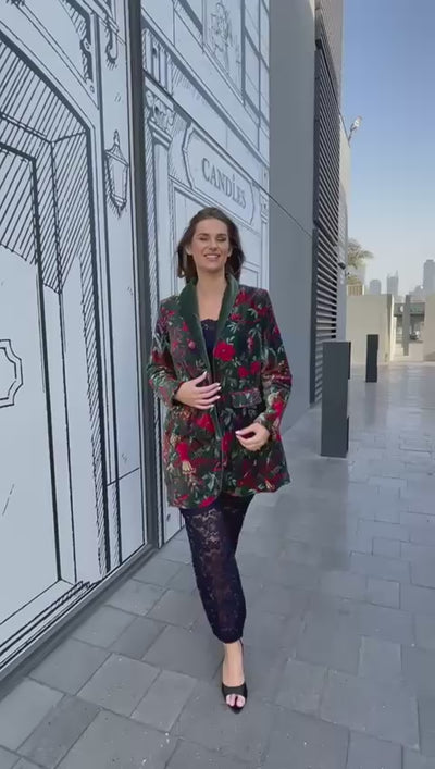 Featuring this is a velvet jacket a deep green background adorned with a detailed floral and bird print in shades of red, purple, gold, and green. The design showcases vibrant blooms and perched birds, adding a touch of artistry and sophistication. It has a relaxed silhouette with a soft shawl collar, front button closure, and flap pockets. Crafted from plush velvet, the jacket offers a luxurious texture and a rich, elegant appearance, blending vintage-inspired charm with contemporary flair.